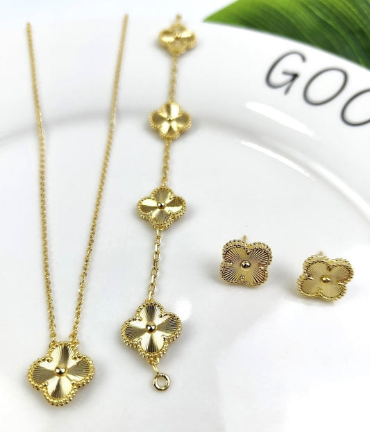 Guilloché Silver Four Leaf Clover Jewelry Set 18K Gold / Silver