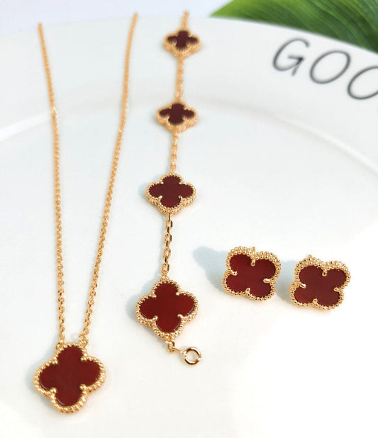 Carnelian Four Leaf Clover Jewelry Set 18K Gold / Silver