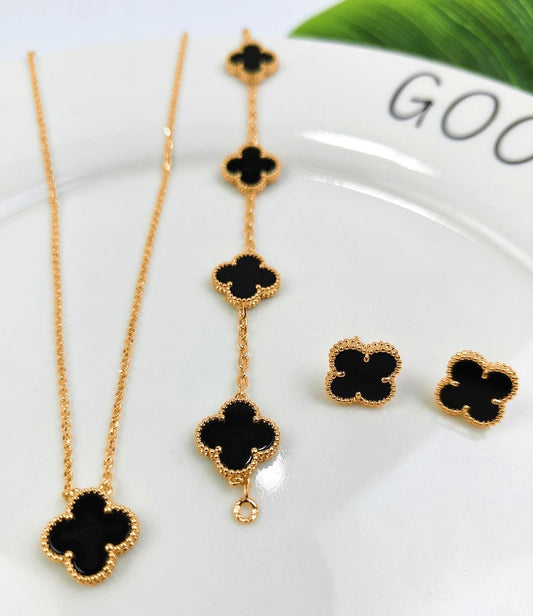 Onyx Four Leaf Clover Jewelry Set 18K Gold / Silver