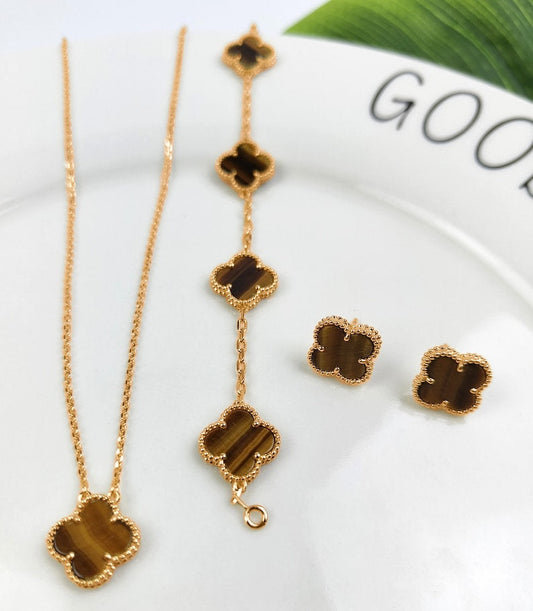 Tiger Eye Four Leaf Clover Jewelry Set 18K Gold / Silver