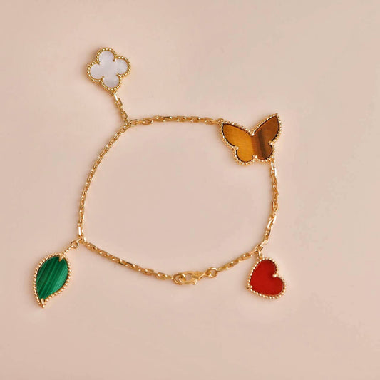Lucky Alhambra 4 Motifs 18K Yellow Gold Carnelian Malachite Mother-Of-Pearl Tiger Eye Bracelet